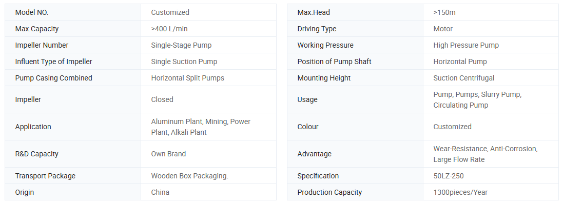 LZ(Y) series solid-liquid two-phrase flow slurry pump is the latest pump with advanced hydraulic theory. The flow passage parts are made of special wear-resistant materials, which are characterized by high efficiency, low energy consumption, low noise, convenient maintenance and installation, and long service life. They have been widely used in industries such as alumina, coal, power, metallurgy, mining, and chemicals, and have a longer service life in harsh working conditions, making them widely welcomed and highly praised by users.