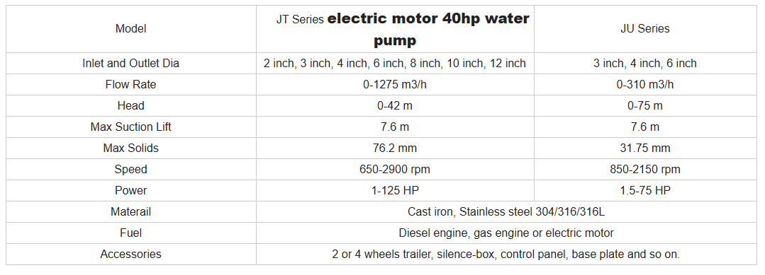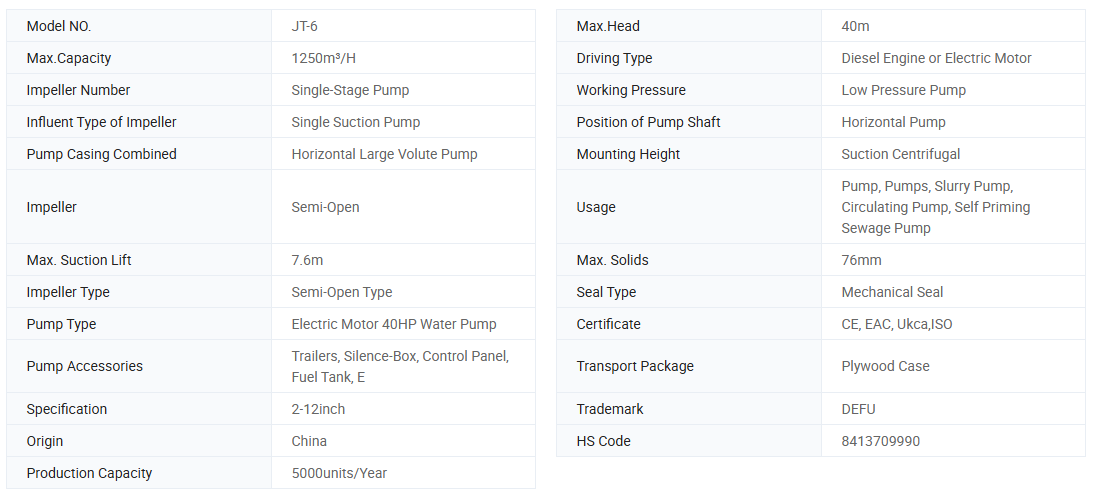 JT series self priming centrifugal sewage pump is a kind of specialized sewage disposal equipment, designed with super strong anti-clogging and impurity disposal capability. It can be used to dispose ultra long fiber impurities and more than 3 inch solids. In addition, because of it's self priming function and high suction lift performance, our water pump can transfer water from river or well. Therefore, This pump can be used as agriculture irrigation pump, dewatering pump and other pump.